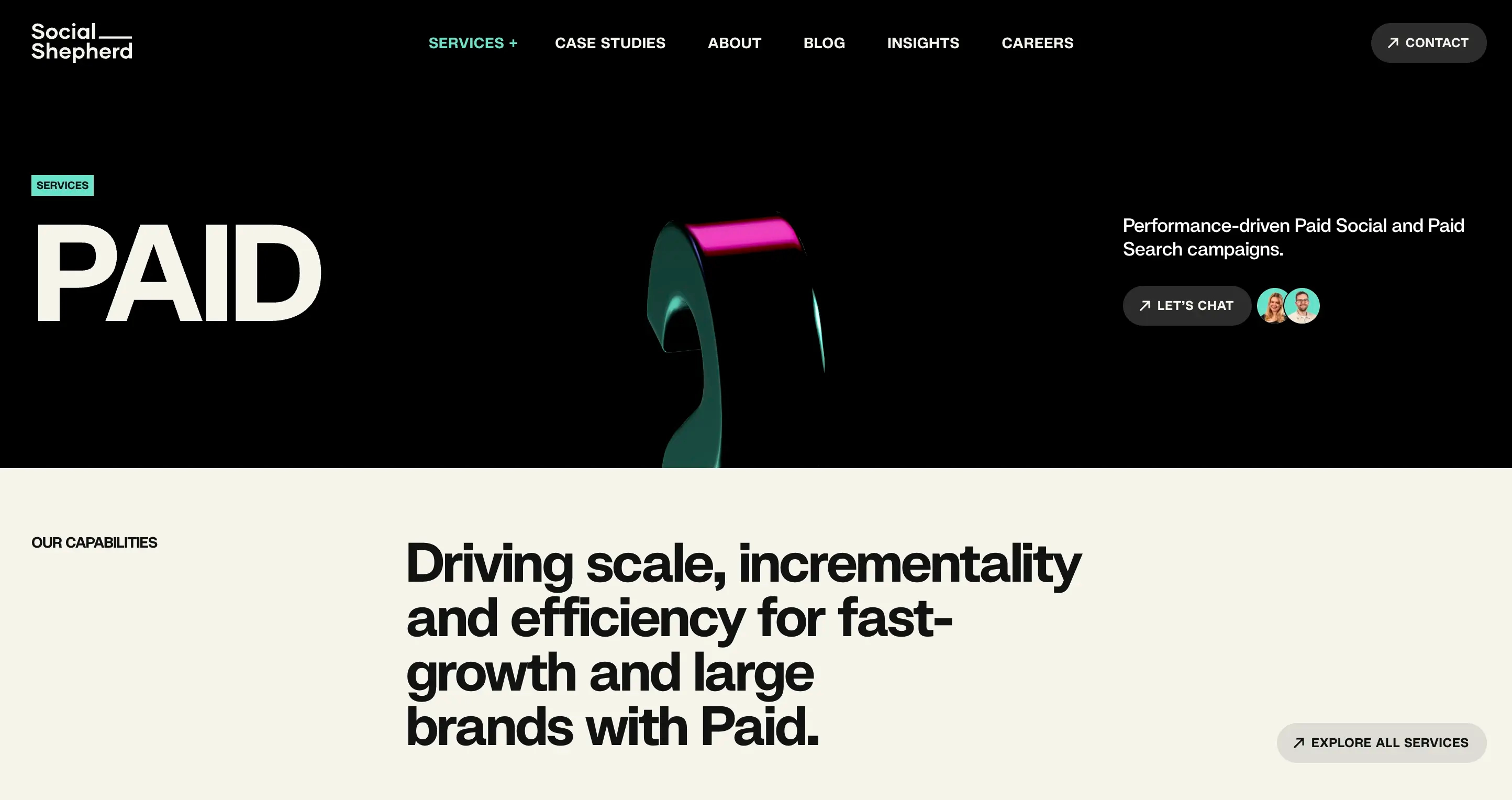 They help them scale with Paid Social, Paid Search, Organic Social, Influencers, Performance Creative and Social Commerce.